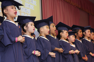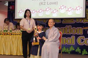 致词后,即由释真信法师颁发最高荣誉奖和6岁组成绩优秀奖、歌唱比赛优秀奖和绘画优秀奖。本年度获得最高荣誉奖的小朋友是章苑婷。接着由各分园主任陪同园长颁发毕业证书予各分园毕业生代表。