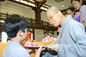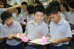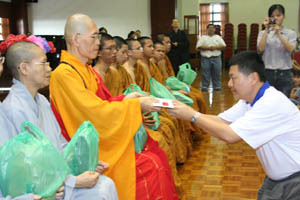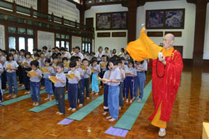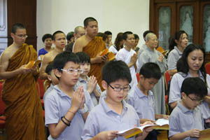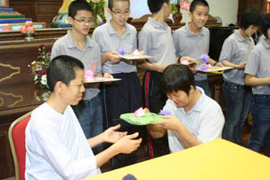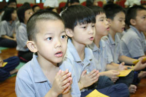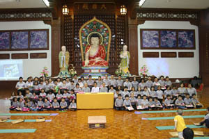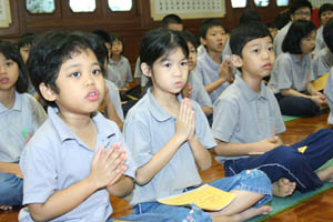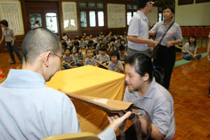 檀香周日佛学班2010 年结业典礼经已在11月14日(星期日)于檀香六楼大雄殿举行,当天学员们也受持福智十善法,授戒和尚为真如师父。师父、爱心家族、家长及学员们济济一堂,场面很庄严和充满喜悦。首先是唱诵炉香赞和大悲咒,过后是洒净仪式。师父在开示之前先带领学员们三称 [南无本师释迦牟尼佛 ] 圣号,因为佛陀传授真理给我们,是我们学习的导师。