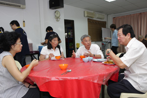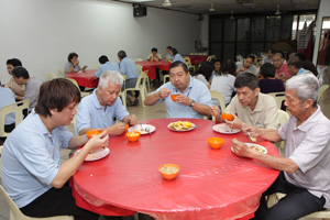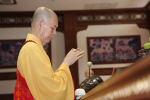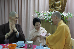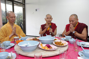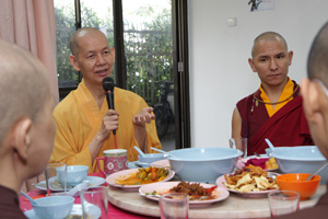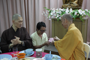 过后,檀香寺常住法师、已故敦林的家属以及檀香寺职员一起聚集在斋堂用斋。檀香寺住持和尚唯悟法师,在饭后开示时指出:佛陀在未成道前,曾修六年的苦行,日食一麦,身体骨瘦如柴。后来,他发现修行要走中道,在放弃修苦行时,到尼连禅河沐浴,又接受牧羊女苏耶妲(SUJATA)的乳糜供养,才恢复了体力。之后,悉逹多太子到菩提伽耶的菩提树下金刚座上端身正坐,立下誓言:“若不成正觉,誓不起此座”。最后,他在农历十二月初八凌晨,夜覩明星而成道,号称"释迦牟尼佛"。