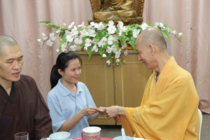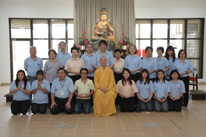 午斋过后,唯悟法师也颁发檀香职员服务奖,予檀香寺服务满五年以上的职员,大众在新的大悲殿里拍全体照,皆大欢喜。