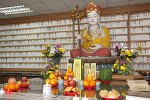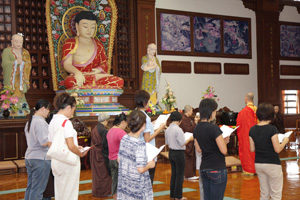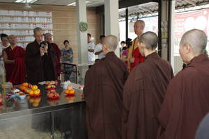 今天适逢已故我国政坛元老,前槟州首席部长敦林苍佑医生往生后的第四十九天,檀香寺在大愿殿为敦林设立临时的往生牌位,其家属以斋饭素菜鲜花水果,一起前来参与佛前大供,随着法师们的梵呗声诵经回向,祈愿阿弥陀佛接引敦林往生西方。