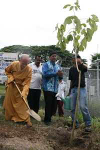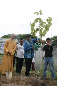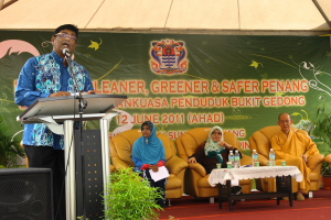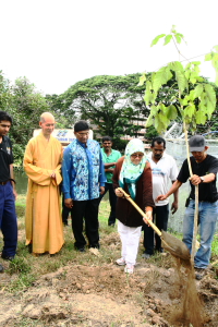 槟岛市政局主席芭提雅代表掌管槟州地方政府委员会的曹观友行政议员,为这项“绿意槟城” 活动主持鸣锣仪式。她稍后也与拉文州议员及唯悟法师在河畔举行种树仪式,并与大众一起把EM泥球抛入河中,以期收到净化河流的作用。