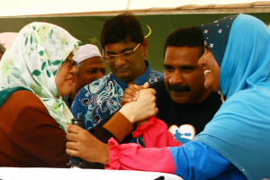 过后,主办当局来了个别开生面的拗手腕(俗称拗手瓜)比赛。槟岛市政局主席芭提雅和工委会主席兰拉也参与其盛。