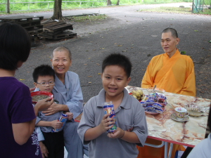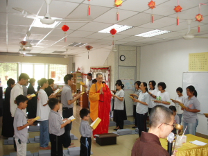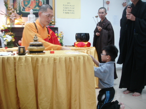 下午2点为传授三皈仪式。14位爱心家族菩萨成员、小菩萨及佛友菩萨发心受持三皈,正式踏入佛门,确立彼等的宗教方向。其中值得赞叹的是,爱心家族们是在禅苑事佛奉献,累积资粮数年后,从而对三宝建立了初步的信心,而选择成为正信的佛教徒。