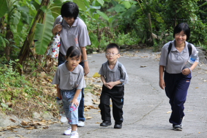 禅苑爱心家族一行32人于约8点半抵达山脚,一些沉重的供品交由以摩托车代步的静修园义工菩萨送上去后,大家就开始在凉爽天气庇佑下,“向上”、“向善法”走。这一走,走了约一个小时,是走得汗流浃背、挥汗如雨,但其过程却充斥满满的户外生活教材、佛法提示。
