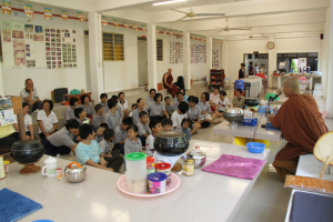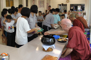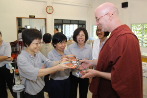 听过Bhante Saddhasiri 的佛法开示,就到了供僧时段。由于大家对南传的供僧方式不熟悉,所以整个过程是在静修园护法居士的教导下完成的;这是个很好的“做中学”体验。供僧后,Bhante Chao Ho 就慈悲为大家简单扼要地讲述两则有关宽恕的故事,以带出“无常”及“宽恕比责骂来得有效且更能深入人心”的佛法教育。