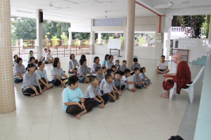 满足了外在的知识后,是时候让内心纳受善法了。休息片刻,大家就齐聚“施堂”恭听住持Bhante Saddhasiri 的佛法开示。法师先问小菩萨们有没有“孝顺父母”。然后提策小菩萨们孝顺父母不能只停在文字上的理解,因为若真的孝顺父母,就会听父母的话,不会让父母担心,心就会柔软;反之,若心强硬不听父母的劝告,长大后在人际、事业上就会容易失败。所有的行动都由意念主导,心若柔软,善意念就会升起,所以我们必须从小训练心的柔软。法师也强调“不杀生”、“不偷盗”的重要性,尤其在现今社会,我们更应该培养我们的德行、人格。接着,法师提到所做过的业因不会随着时间而消失;因缘具足时,业果就会浮现。最后,法师警惕大家不要把烦恼带进来;并解释说,我们所认为的“我看到”、“我听到”等等认知,其实仅仅是“触”的现象而已;这其中只有现象的变迁过程,并没有一个实质不变的“我”。烦恼都是因为错误的知见 —— 即认定自己所接触的一切,都是“我”在经验与感受 ——才会产生的。