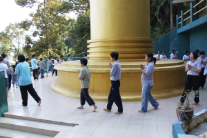 接着下来大家赤着脚,在静修园佛学会执委文诚菩萨(Bro Boon Seng)的带领之下,四处走走,看看十方信众宏伟愿力所成就的巍巍寺院。其中有初期建立的佛殿、分散两旁的初期及后期的寮房、高大庇荫的菩提树、莲花池,还有“戒堂”(Sima Hall)。除了对各个建筑物做解释介绍,文诚菩萨也不时沿路赞叹以前信众如何用心铺好道路、及完善所有的基本设施。来到舍利塔前时,大家就列队收摄心念恭敬称诵“南无本师释迦牟尼佛”圣号并绕塔三圈,然后回向功德。