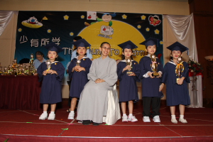 当天出席的家长、来宾人数很多。会场内座无虚席,气氛热闹。下午两点整,师父及园长入席后毕业典礼暨颁奖典礼正式开场。国歌奏起时全场肃立,随后大家双手合十恭唱佛宝歌。接下来是檀香寺常住真醍法师及大山脚分园主任李老师分别致词,紧接着是进行颁奖典礼。颁奖礼结束后是颁发毕业证书仪式及毕业生代表致词,再唱毕业歌。毕业生们头上戴着四方帽,身穿蓝色的毕业袍在台上唱起毕业歌,声声悦耳动听。