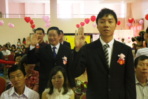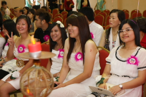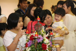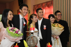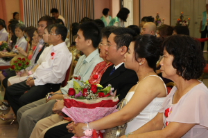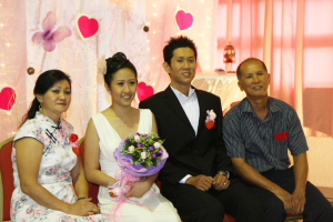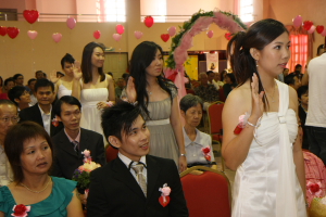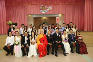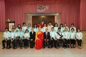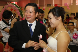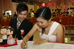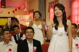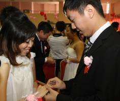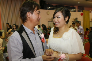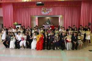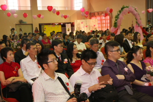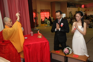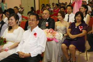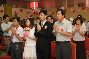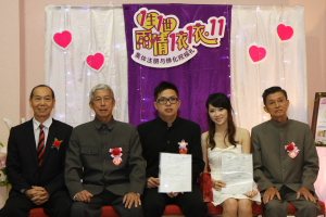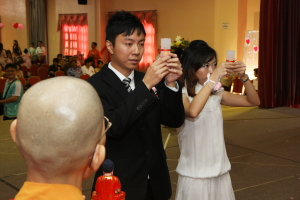 2011年11月11日,这日期包含6个1,隐含 ‘一生一世两情依依’。檀香爱心福利中心特于这个寓意深远的日子,在檀香寺五楼多元化礼堂主办集体注册及佛化祝福礼。当天共有30对新人——上午20对,下午13对——在现场观礼的亲友们的祝福声中,及婚姻注册官助理陈炳根居士的主持下,互相向对方说出“我愿意!”。