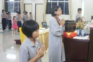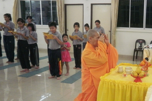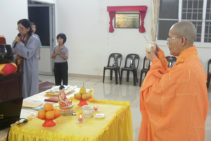 当天下午,周五佛学班的学员、爱心家族及学生家长们在净苑佛殿集合,下午二时正仪式正式开始。唱颂三宝歌后,由锦杉老师带领大众念诵炉香赞、大悲咒,三称南无甘露王菩萨摩诃萨,接着是真信法师进行洒净仪式并为大众慈悲开示。