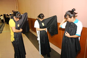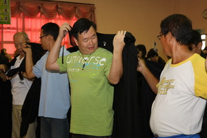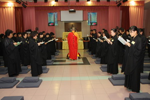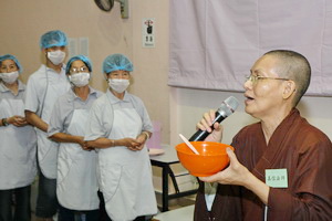 五月三十一日星期四中午十二时始,在众盼期待下,许多同修带着虔诚的心情,陆续来到檀香寺报到。三点正,真信法师在五楼多元化礼堂向大家讲解佛三规则。四时正,真醍法师为大众讲解并示范学佛行仪,如搭海青及礼佛的正确方法。下午五点半,众同修到五观堂享用药石。在药石开始前,真信法师慈悲教导大家如何插班。另外,在斋堂里,法师也告诉大家用斋的规范,让大众学习活在当下,一心不乱、间中培养慈悲与惭愧心。比方说,大家在用斋时,标准的拿碗姿势要有如“龙含珠,凤点头” 、手拿椅子时要注意动作放轻等等。