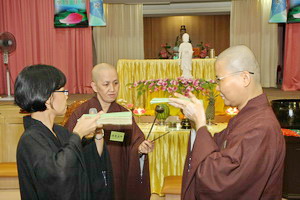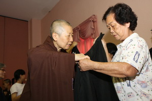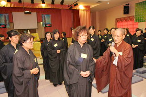 在佛三的首日,大众的心情,或许还没办法完全摄身守意,有者甚至是初次参加佛三的。无论如何,在众法师们於佛三每个环节的循循善导下,又有檀香寺常住细心安排大众的生活点滴,还有多位义工菩萨的护持等,相信每位参与的信众倍感温馨和法喜。法师还慈悲地不断叮咛大众,参加佛三者,即是表示自己就是出家了,唯独没有落发,所以更要倾力精进念佛。佛三正式开始了,大众感恩之余,铭记法师们这一天的教诲,默默地期许自己在这三天放下万缘,专精念佛。晚上约九点半后,大众便回寮休息了。隔天早上就是正授八关斋戒的环节,“我要出家了,我现在出家了!”,大家无不期盼着这一刻的到来。