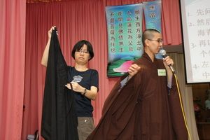 真如法师开示结束后,悟果法师慈悲教导大众学佛行仪。在这一环节里,法师告诉大众如何在行住坐卧精进念佛的诀窍,莫管他人身口意业如何造作,只管自己把心收摄在佛号上。另外,法师指导大家如何走路、放掌、问讯、传经书、捧经书、念佛等。法师也指出一般人对念佛法门的错误观念。