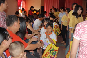 早餐过后是团康环节。在三位爱心老师的带领下,孩子们都非常投入地唱唱跳跳。小朋友的吸收能力相当强,在短时间内就把歌曲记下了。团康歌曲有《地球的孩子》、《爱心小菩萨》、《发好愿说好话》和《幸福的脸》。