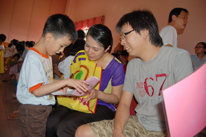 下午2时,是亲子交流会时刻,出席的家长相当多。首先以《欢迎歌》来欢迎在座的家长。接着,各组爱心老师带领小朋友绕圈圈并与在座的每一位家长握手,同时把《佛光照耀你》及《We Are A Happy Family》献给在座的每一位家长。当孩子们走到爸爸妈妈跟前,才把手上的环保袋送给爸爸和妈妈。