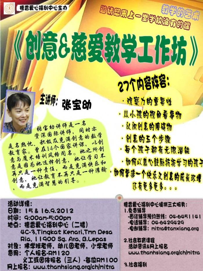告诉您一个好消息!檀香爱心福利中心有幸邀请到资深国际创意教学讲师-张宝幼前来给槟岛一带的灵魂工程师一个为期两天的工作坊-《创意&慈爱教学工作坊》。张宝幼讲师是名活跃于创意教学的国际讲师。她以创意及魔术的培训课程闻名,曾多次受邀到国外讲课,目前共去过十四个国家开工作坊及讲座,在创意教学方面拥有多方面的丰富经验。宝幼深受各国学员的好评。张宝幼,资深国际讲师相信:“每一位孩子都有无限的潜能。只要家长和老师用对的方式,让孩子