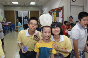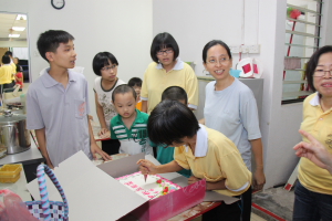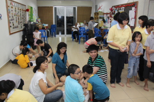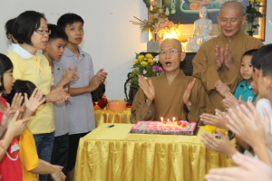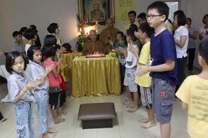 8点15分,真如法师带领大众回向,并与大众齐唱佛化生日歌、切檀香禅苑六周年庆的蛋糕。紧接下来,就是进入万众期待的余兴节目及中秋猜谜---该节目分成个人式与家族式的猜灯谜游戏。为了得到由爱心妈妈们亲手所做的美丽灯笼及礼物,一家大小聚精会神,搔首拍额地思考灯谜的答案。游戏在一片热闹与融洽的声浪中进行着,顿时把整个庆典的欢乐气氛炒到了极点。