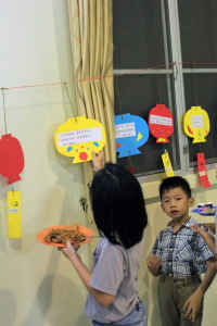来宾们先品尝香积膳食组的菩萨们和部分出席者所准备的各种素食。大家一面大快朵颐,一面观赏投影在墙壁上的活动照片,回顾今年檀香浄苑所举办的活动。部分出席者也兴致勃勃的射灯谜,射中者可获得小礼物。
