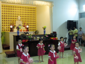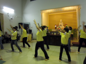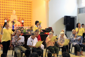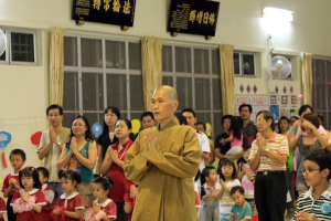 师父开示完毕后就是余兴节目时段。首先,檀香晚晴苑的老菩萨呈献两首歌曲,歌名是“功圆果满时”和“来学佛”;接着,檀香周五佛学班的学生呈献手语“幸福的脸”,希望所有的人都可以从歌词中领略幸福的内涵;接下来,檀香幼儿园的小朋友们也带来手语“你打开我的眼睛”;最后,檀香幼儿园的老师、员工及义工带领来宾一起跳健康舞,为表演时段划下完美的句号。