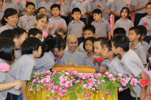 最后一个环节为“庆生会”。真醍法师也为檀香寺及檀香禅苑周日佛学班的小菩萨与爱心家族们庆生。大家都很开心地往前接受法师的祝福。同时,礼堂内也播放着《含泪的感恩》: “……可曾知道当两个生命挣扎着生存,是痛苦与欢乐的交响,是含泪的满足,或许会有那样的一天,你终于体会到,世间最珍贵的母难日是无可取代的……”,提醒大众生日之所以也被称为“父忧母难日”的原因。法师也借此希望大家不要忘了父母亲的养育之恩,要知恩、感恩、报恩,好好的孝顺父母亲,做个真正孝顺的佛弟子!