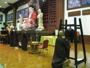 新春吉祥灯洒净仪式过后,大众一起到大雄殿继续下一个节目,法师带领大家称念佛号、敲钟、忏悔、发愿,过后由住持唯悟法师开示佛理,和带领大众互相感恩。接下来维那师父带领早课,念诵普贤十愿、三皈依、赞礼韦驮菩萨和礼祖,然后大众向法师们拜年,领取法语红包。
