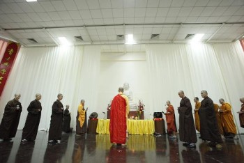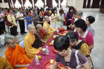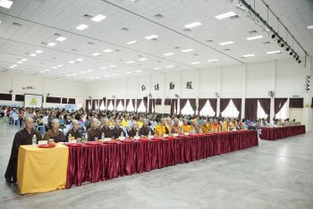 最后,信徒们及菩提国中依序排队向法师们拜年和领取结缘品。