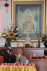 大约7时20分左右,法师为大众慈悲开示。首先,法师以周利盘陀伽尊者的故事——《扫尘除垢》与大众分享,从而警戒大众须:(一)相信因果;(二)种善因得善果;(三)勤修戒定慧,熄灭贪嗔痴。法师也叮咛大众要时时精进念佛,时时忆念无常,如普贤菩萨警众偈中所言:“大众,当勤精进,如救头燃,但念无常,慎勿放逸”。