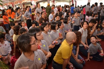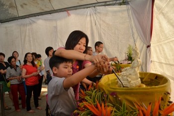 论到我们供佛时,已将近10时30分。学生们列队走向佛前,工作人员便分派供品予我们。拿到了供品,大家就分排跪下,先礼佛三拜,然后才进行供佛。供佛完毕后,藏传法师使用舍利塔轮流放在每个信众的头顶上加持。接下來,大家再次排队去浴佛,浴完佛后我们就去参观高僧的舍利子。最特別的舍利子,居然是一颗完整的眼球。