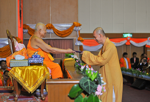 “......通过他在寺院管理、教育事业、弘扬佛教,社会福利等领域的付出,对佛教、国家乃至世界做出巨大的贡献,为诸多众生带来无比的利益。因此最尊贵的法师是值得让人赞誉和称道的。摩诃摩古佛教大学董事会能在此为其颁发佛学研究荣誉博士学位而倍感殊荣。公元2013年(佛历2556年)5月19日颁。”