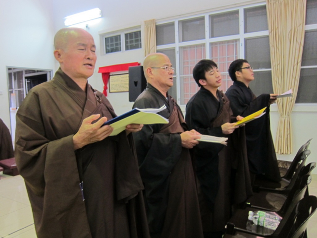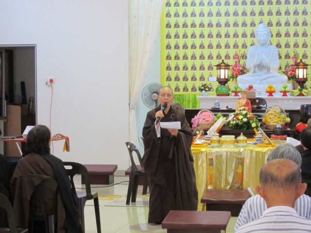 当天大约有八十位信众来参与孝亲法会, 让一整天的念佛共修、三时系念佛事顺利完成。上午九时正至十时五十分的念佛共修环节,法师与工委、信众们一起修持,保持正念的念佛,念法,念僧,净化人心,庄严整个道场。上午十一时正,是佛前大供、延生坛回向、净土坛回向。念佛功德回向给布施者和往生者,表达出对受者的一份尊敬心。中午十二时是休息和用午斋时间,让大家有精神和体力应付接下来的共修环节。