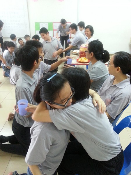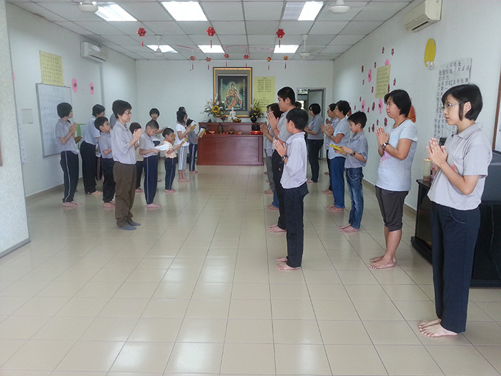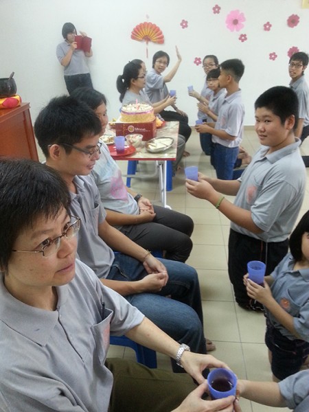 总结过后就是庆生会时段。这是一天大家都生日的日子,没有分月份。经过爱心家族大略解释庆生会的来源后,部分学员就跪着跟家长们奉“茶”(黑加仑子果汁)以感激父母含辛茹苦的养育之恩。随后,大家就一起学习唱“含泪的感恩”,学习从歌词中领会何谓“父忧母难日”。之后就是开开心心的大声唱“佛化生日歌”、许愿、切蛋糕,然后供养,用早斋。