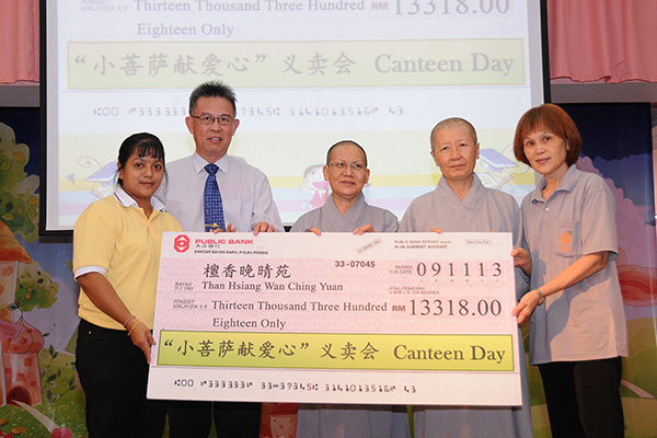 今年,幼儿园在老师、家长以及爱心妈妈的合作下,于8月17日主办“小菩萨献爱心”义卖会。义卖会共筹得1万3318令吉,将捐助檀香晚晴苑的老菩萨。幼儿园园长Sandhi老师在真信法师及檀香教育总监蔡耀祖校长的见证下,将模拟支票移交于晚晴苑代表真念法师及莫月好居士。