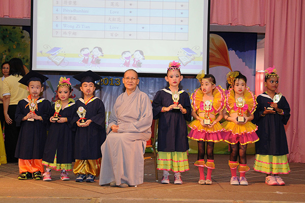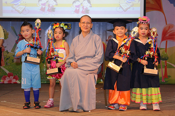 之后,檀香寺女众监院释真信法师颁发最高荣誉奖及总园各项比赛奖项。今年的最高荣誉奖由黄崇恩(幼二大红花)、陈霈轩(K2 Love)、涂凯文(K1 Happy)与黄韵宁(幼一迪波龙)荣获。檀香教育总监蔡校长与爱心妈妈主任接着颁发分园各奖项。