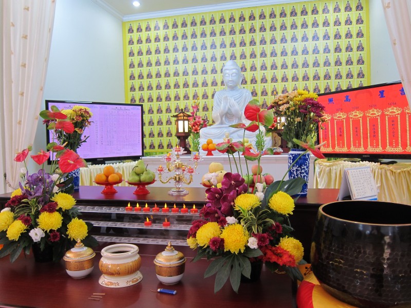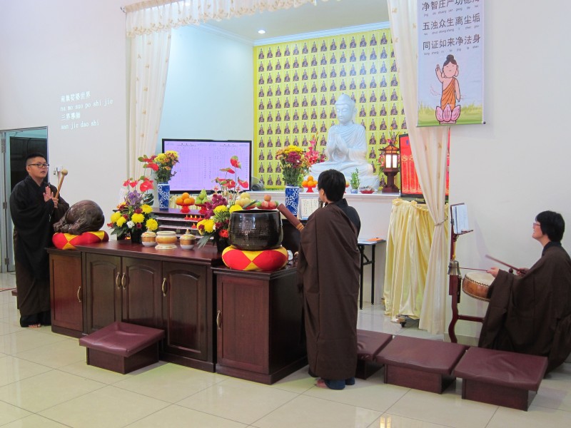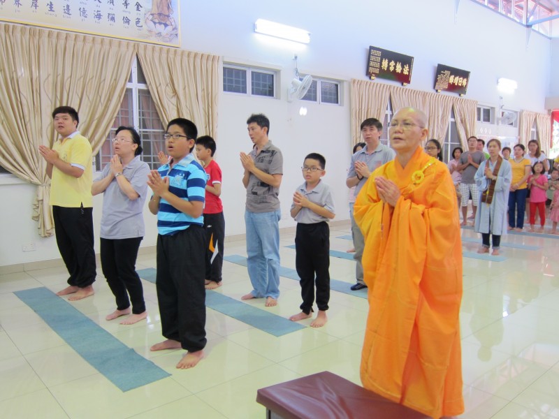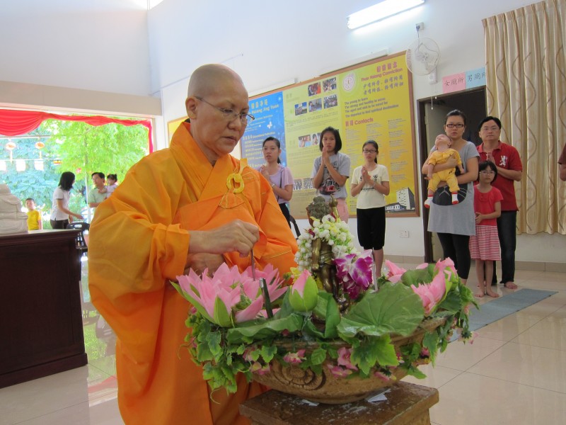 《炉香赞》拉开序幕。接着,大众坐下观赏真信法师播放的两则视频——唯悟法师于2014年5月11日(星期日)在檀香寺浴佛法会的开示内容《浴佛的意义》和《向伊斯兰教刑事法说“不!”》。