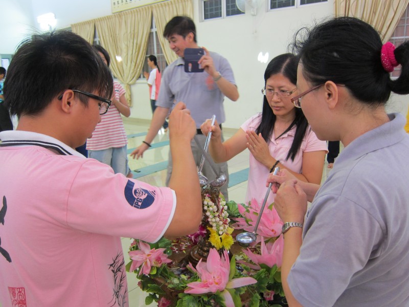 观赏了两则视频后,大众三称南无本师释迦牟尼佛圣号并唱诵《心经》和《赞佛偈》。接着就是浴佛法会的“高潮”时段——大众在真信法师的带领下,一边虔诚地唱诵《浴佛偈》,一边依次序列队出班浴佛,希望借此能提醒大众通过佛陀的法水来清洗自身的贪嗔痴等尘垢。浴佛法会仪式在大众浴佛完毕及维那带领大众作三皈依和回向后结束。