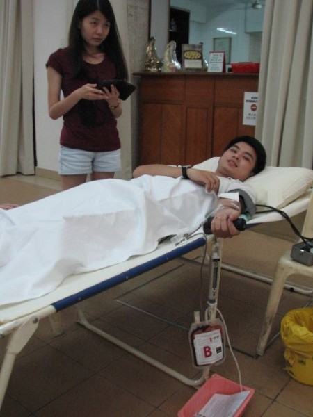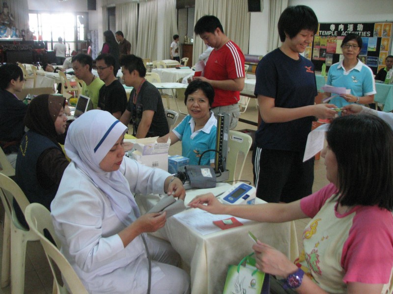 5月3日几位檀香爱心福利中心的义工一大早就把桌子和椅子搬到大悲殿,开始布置场地。欲发挥济世救人的热心捐血人士陆续到来。接近开始的时间,人潮渐渐增多。大山脚医院共派来了14位医务人员。他们在底楼大悲殿摆设床位,设立测血、量血压和登记柜台。捐血者先到登记柜台填写联络资料和中央医院的问卷。领取号码之后,经过验血型、基本资格测量如体重、脉搏、血压和血红蛋白水平等的测试后,符合资格者才准捐血。多名在场护持的义工们,出力服务之余也不忘参与捐献血液。这些菩萨既布施时间和体力也布施血液。檀香爱心福利中心也不忘为工作人员和捐血者准备热饮料和小食,感谢他们无私的奉献。捐血运动在下午2时准时结束。