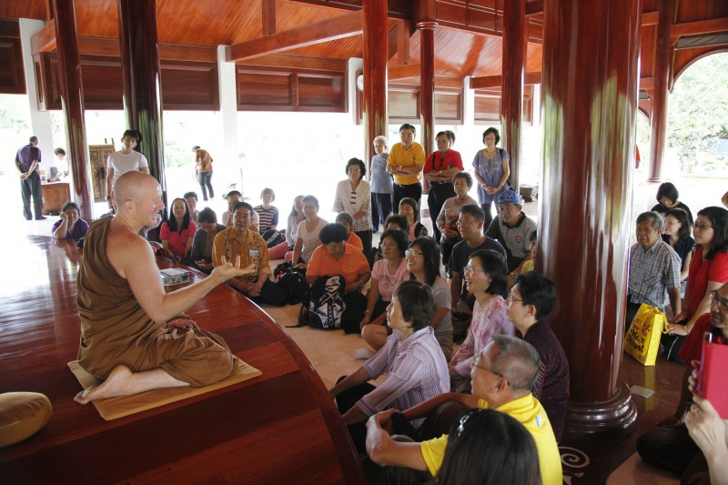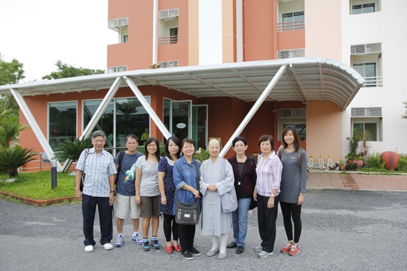 在礼堂举行的教学楼开幕仪式上,董事长兼槟城檀香寺住持唯悟法师报告:泰南康月镇的校园,面积110英亩,2003年获得泰国政府准证兴办大学。2010年在呵叻买下丝绸工厂地坡,开办分校。唯悟法师在俗时原名梁嘉栋,曾留学纽西兰考获电机工程学位,以品质管理和策划能力驰名。报告完毕,由校长(职称是Rector,貌似洋人)和一位老教授讲话,都很简短。散会后众人在教学大楼前合影。
