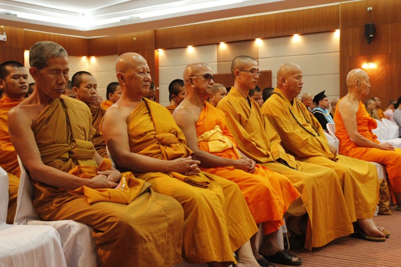 首先由董事长唯悟法师、校长和副校长三人进行点灯仪式。然后是董事长致词,应用双语,华语和英语穿插并用,讲来心平气和,缓慢,简短。接着是副校长和一位教授讲话,都不冗长。副校长身穿礼袍,看来像印度人或斯里兰卡人,在仪式上担当重任:在颁发博士学位时,他走到校长座位前报告:“敬爱的校长......某某某已修完博士课程,请准予颁发博士学位......(大意)。在颁发硕士、学士学位时,也如此报告,而且还分科系呢!他先用英语,再讲华语,他的华语,应是后来自学的,学习精神可嘉。获颁博士学位的,是一位僧人“阿增”,看来像泰国人。硕士、学士毕业生几乎全穿南传的僧服,只寥寥数人穿世俗的毕业礼袍,样子像华人,我问身傍的韩国女学生,她说那是韩国人。