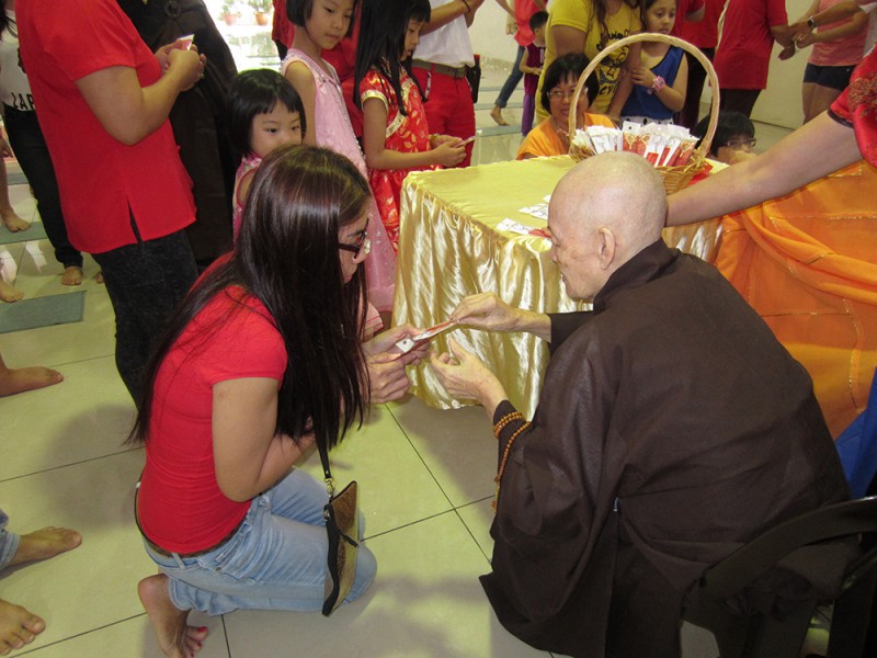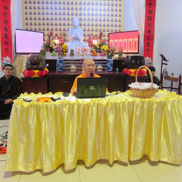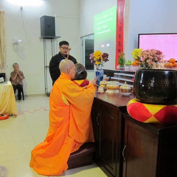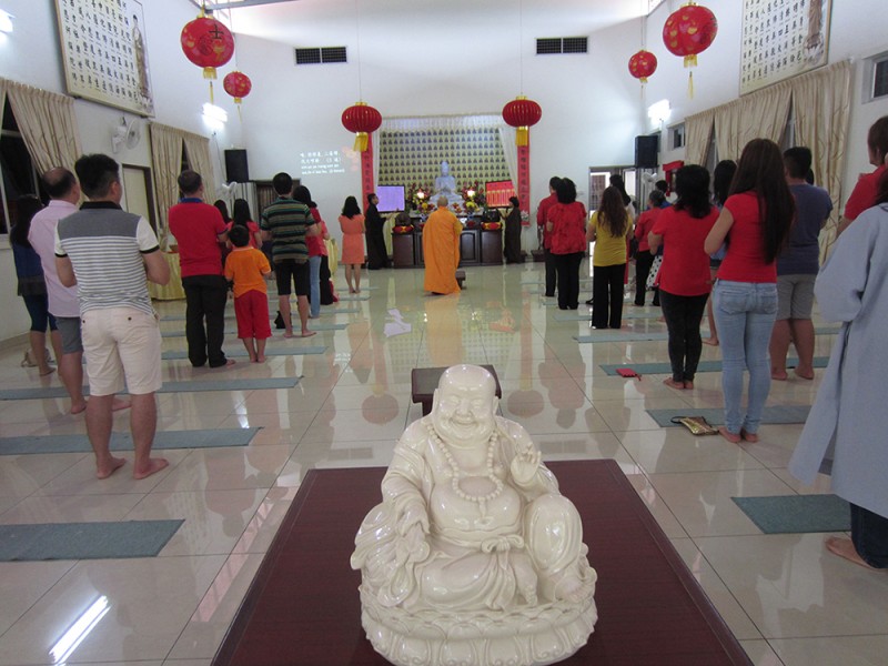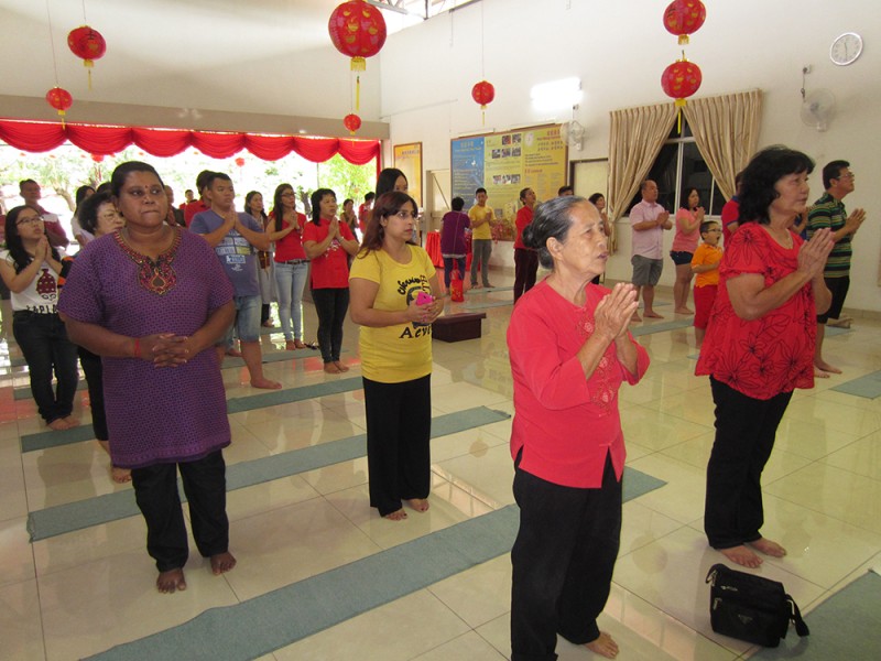 农历正月初一早上11时,约70位佛友齐聚檀香净苑佛殿进行佛前大供和新春吉祥灯回向。在新春吉祥灯回向里,大众三称南无增福寿菩萨摩诃萨和南无消灾延寿药师佛,再念药师灌顶真言七次并回向。新春吉祥灯回向将继续进行至正月初九,并在早课后进行。大众向上真下信法师和上净下观法师拜年及领取祝福礼后,就到五观堂一起享用美味可口的素肉骨茶午餐。