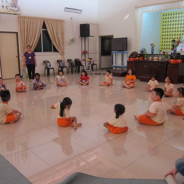 吴老师指导爱心老师们学佛行仪一问讯,再由各小组老师带领各组小菩萨学习礼佛。上午10点整,小菩萨们开始享用生活营的第一顿营养早点。小菩萨们都有依照老师的指示,虔诚的齐偈及结斋偈。 小菩萨们在享用早点后积极地演练三只小绵羊戏剧以备表演。紧接下 来,是游戏环节。游戏名称是丢手绢,小菩萨们显得格外精神,尤其 是在你追我躲的情况下更为紧张,在旁的爱心老师们都为该组的小菩 萨加油打气。游戏结束后,尚可听见部分的小菩萨正哼着游戏时的歌 曲。