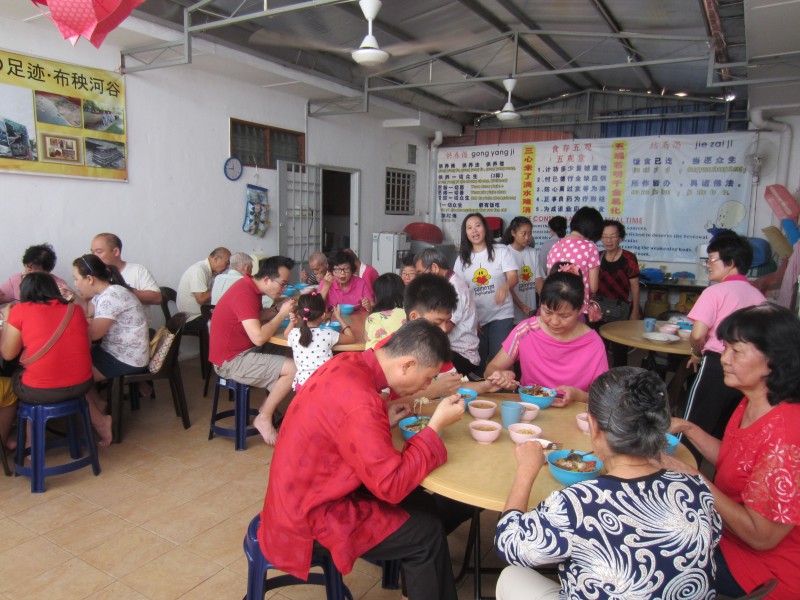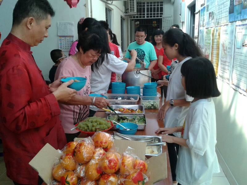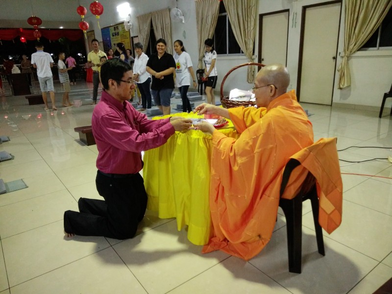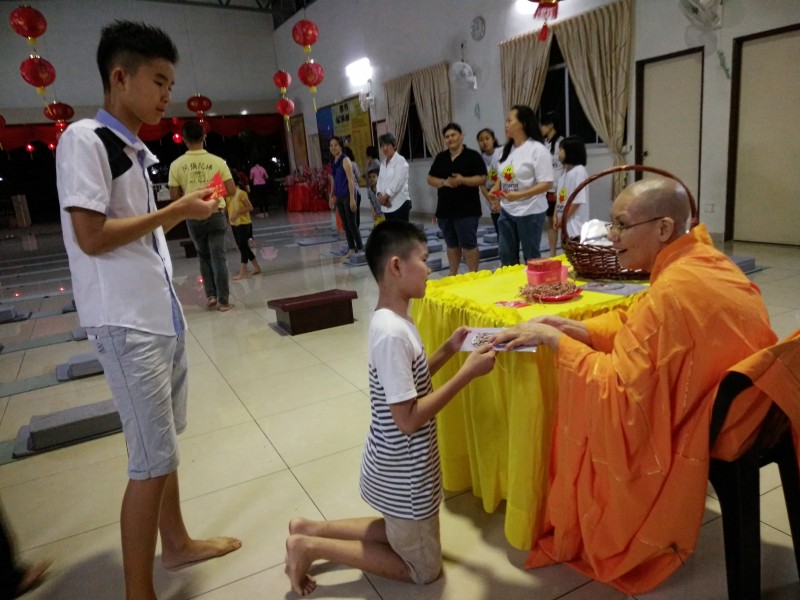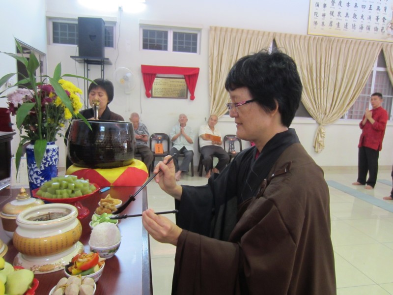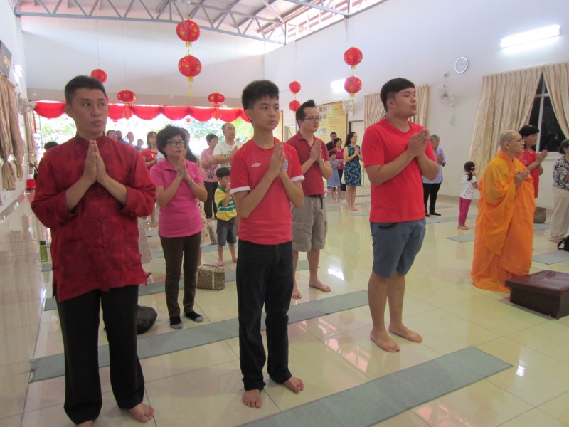 农历正月初一早上11时,佛友们齐聚檀香净苑佛殿进行佛前大供和新春吉祥灯回向。在新春吉祥灯回向里,大众三称南无增福寿菩萨摩诃萨和南无消灾延寿药师佛,再念药师灌顶真言七次并回向。新春吉祥灯回向将继续进行至正月初九,并在早课后进行。大众向上真下信法师拜年及领取祝福礼后,就到五观堂一起享用美味可口的素肉骨茶午餐。