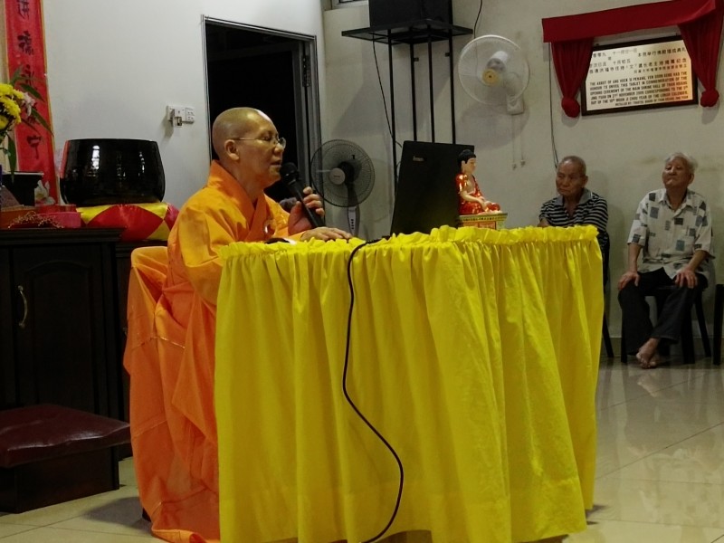 洒净仪式结束之后,大众坐下聆听上真下信法师以《快乐是由自己决定的》作为主题的开示。首先,法师以“哭婆笑婆”的故事启示大众一件事情是好是坏,关键在于人们自身认识、思维和看问题的角度。如果能以正面的心态去观察一切及和別人互动,那么自己的痛苦就会少一点,快乐就会多一点,心性更稳定。
