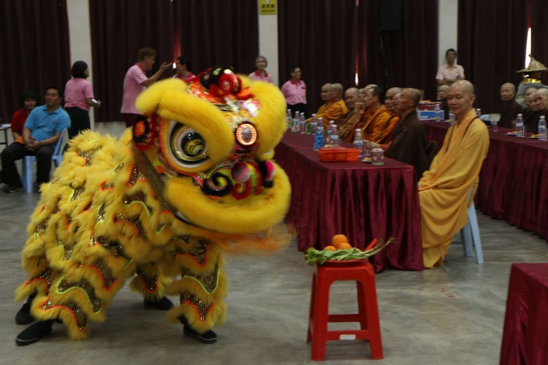 从下午1点45分开始佛友们陆续进场。下午2点正,在两头祥狮的开路下,贵宾们入席就坐。两头活泼的祥狮到台前采青、向唯悟师父拜年。洪亮的锣鼓声响彻整个大礼堂,祥狮伴着喜气满满的铜锣节奏调皮地游走礼堂,直到身影逐渐淡出人们的视线。