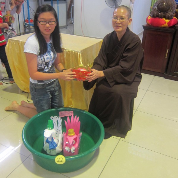 提灯笼游行的队伍回到佛殿后,环保灯笼制作比赛颁奖典礼开始了。奖励共有10份。获得安慰奖的是陈诗涵、黄紫潆、邱巧叶、SAKTHI和欧勇君;林丽敏、赖玉凤、刘柔妤和林欣妤则获得优秀奖;作品获得评审团青睐的林丽婷获得特优奖。恭喜所有得奖的参赛者,没有得奖的参赛者请再接再厉。