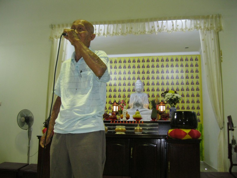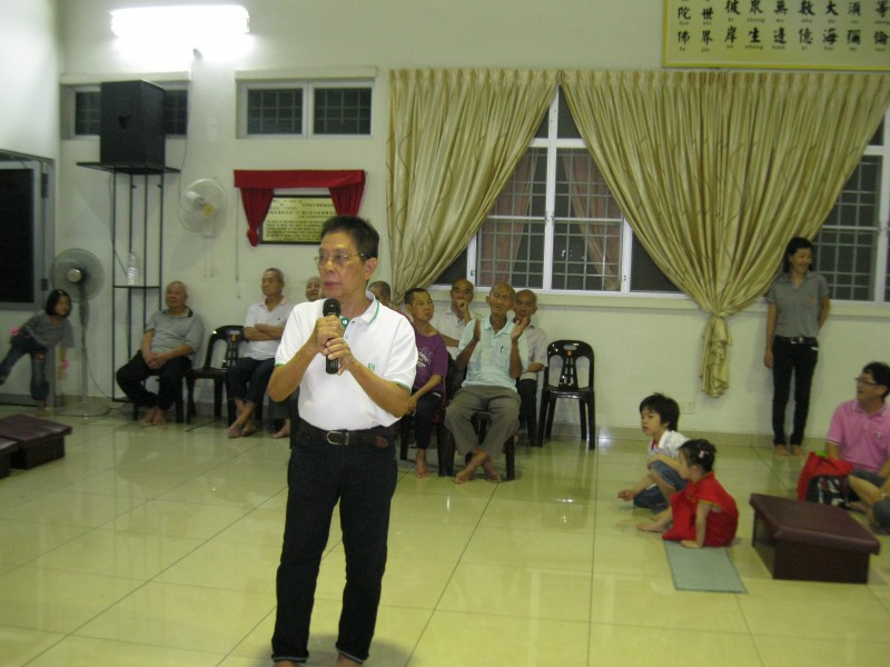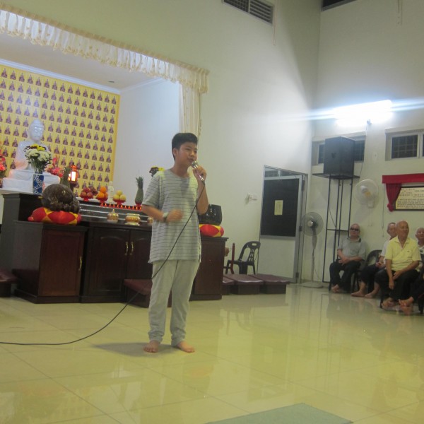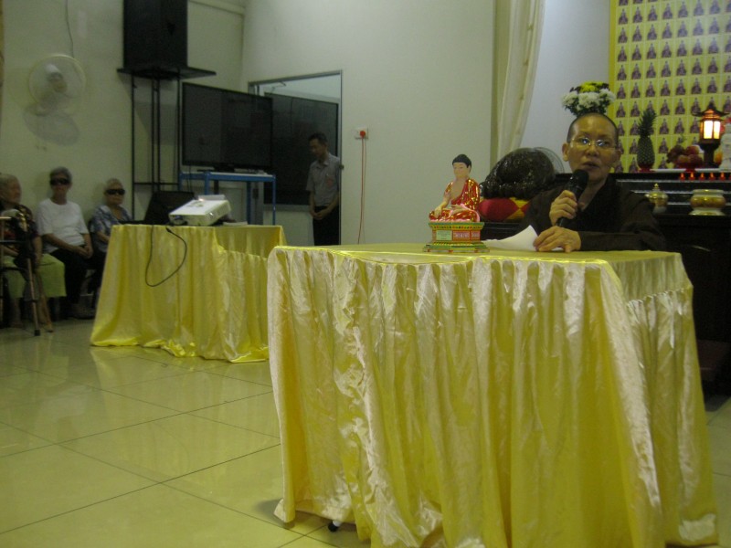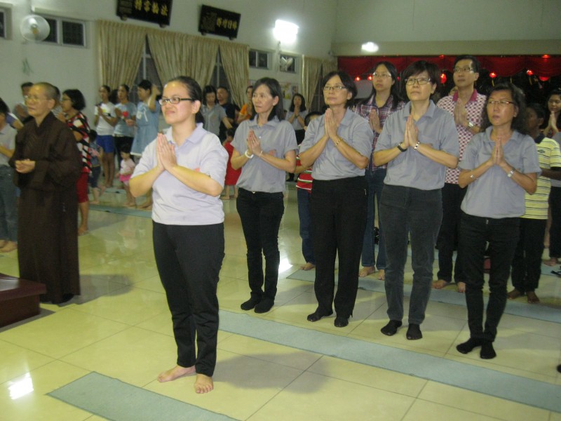 晚上七时半,凤嫦师姐在集鼓声后带领大众摄心念佛共修。大众坐下念诵阿弥陀佛圣号完毕之后,真信法师为大众慈悲开示。真信法师说中秋节是家人团聚庆祝的节日,也是春种秋收后一家大小庆功的日子。佛教讲的因果 “种如是因,得如是果”和大自然的法则是一样的。若要得到快乐的果,必须种下快乐的因。同样的,如果希望一家和睦、快乐,就必须播种和睦相处的种子。