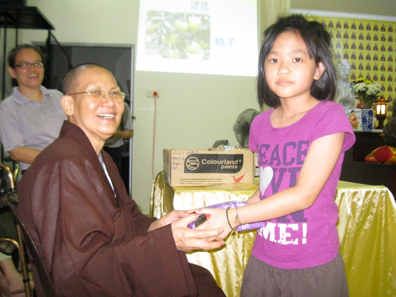 真信法师开示完毕,就到了射灯谜的环节。金清老师以幻灯片的形式展示灯谜让大众猜射。由于现场反应踊跃,因此要揭开谜底的来宾得排队,老菩萨则有优先权。金清老师解释谜底后,真信法师颁发小礼物给答对的来宾。