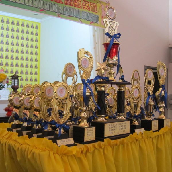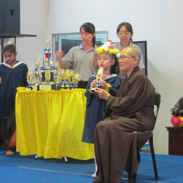 致词完毕后,檀香寺女众监院真信法师代表颁发在学术、歌唱及绘画中表现优异的同学,以资鼓励。接着,由吴宝琴主任在毕业仪式中颁发毕业证书予毕业生代表杨千乐同学。