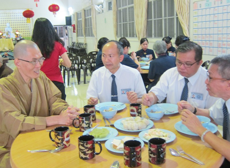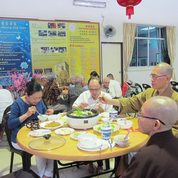 流光易逝,弹指间又到了双溪大年檀香净苑这个大家庭的成员喜庆团圆的美好时刻。2017年1月13日(星期五)傍晚6时15分,双溪大年檀香净苑于大雄宝殿举办丙申岁末团圆晚宴。大众在新年歌曲的陪伴下,列队拿取香积菩萨们准备的美味佳肴,然后就座好好享用并观赏以幻灯片形式展示的2016年檀香净苑活动照片。