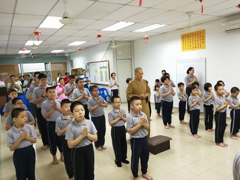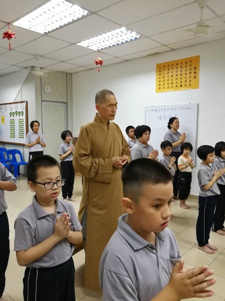 随后,法师也提及檀香的共识——四大信念。其中“少有所学”即是学习福智十善法。当中最重要的三个善法为在家“孝顺父母”,在学校“尊敬师长”,在社会“亲近善友”。法师也说福智十善法与五戒相关,即不杀生(爱护生命)、不偷盗(感恩知足)、不邪淫(不看无益书或善用时间)、不妄语(诚实爱语)及不饮酒(爱人爱己)。法师也说念佛是因为有烦恼,为灭除妄想,所以念佛以得心情清安详。